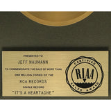 Detailed Item Description: This is a first presentation RIAA Gold single award that would have been manufactured in 1978 which makes this award approximately 44 years old. It is presented to Jeff Naumann, who at the time was with RCA Records as a promotions executive.