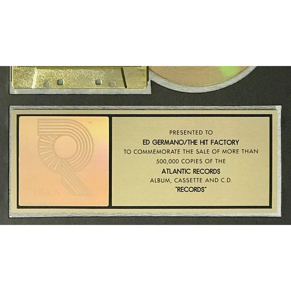 Detailed Item Description: This RIAA Gold Album award was manufactured around 1990, making it approx. 35 years old. The album remained certified Gold all the way from 1983 until 1991 at which time it was certified Platinum and later 7x Multi-Platinum. It is presented to The Hit Factory® recording studio and its' owner, the late Ed Germano, who owned the facility since 1975.