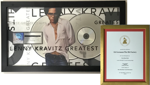 RIAA 3x Multi-Platinum Album Award for Lenny Kravitz album Greatest Hits, new, sealed in original shrink wrap and 2000 Grammy Win plaque for Best Male Rock Vocal Performance for "Again", the new single released on this album. Released on Oct. 24, 2000, it was certified 3x Multi-Platinum by the RIAA for three million copies sold on April 18, 2001.* This is a very unique award, with multiple "3D" type elements in a shallow shadow box.