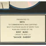 RIAA 4x Multi-Platinum Album award for Savage Garden's debut album. The Australian group's debut was released on April 11, 1997. It was certified 4x Multi-Platinum on May 20, 1998 for four million copies sold.
