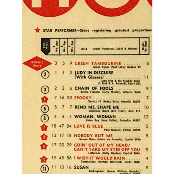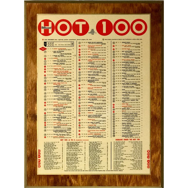 Billboard plaque celebrating the Hot 100 for week of Feb. 3, 1968. On this week, "Green Tambourine" by the Lemon Pipers topped the chart. Other highlights from the top 10 that week included the venerable Aretha Franklin at #3 with "Chain Of Fools" and instrumental favorite "Love Is Blue" by Paul Mauriat. Further down the list were tracks that would soon rise up from Otis Redding, Sam and Dave, Cream, and more. This plaque was made for radio and music industry staff and owned by a radio DJ and station owner.