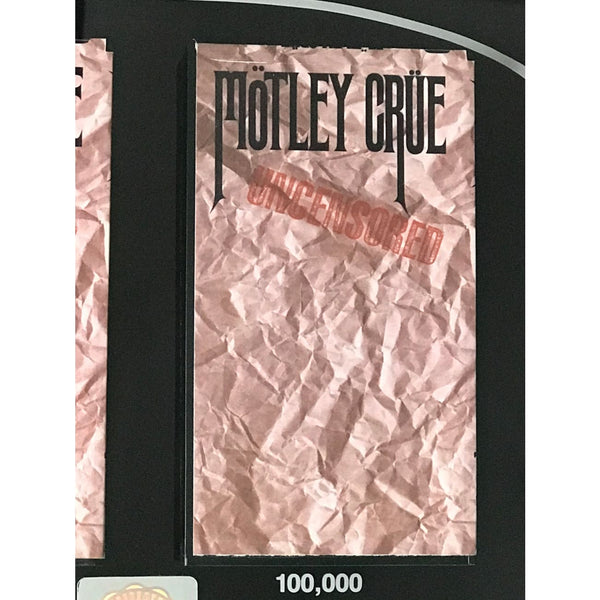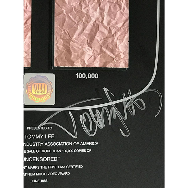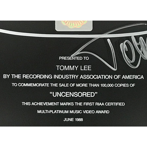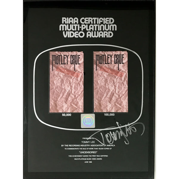 RIAA Multi-Platinum Video award for Mötley Crüe video Uncensored presented to and signed by Crüe drummer and songwriter Tommy Lee. Released on Oct. 27, 1986, and by Feb. 1, 1991 this longform video was certified 2x Multi-Platinum by the RIAA on Feb. 12, 1991 for 200,000 copies sold. This special award is notated on its' presentation plate "this achievement marks the first RIAA Certified Multi-Platinum Video Award, June 1988", apparently referring to the fact that such high sales of a video had not previously been achieved.
