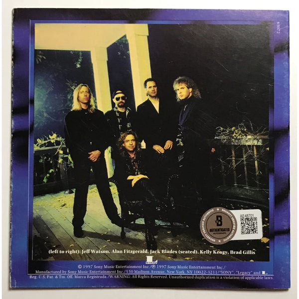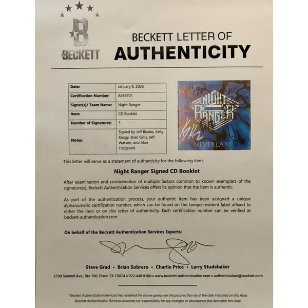 Night Ranger 1996 CD booklet for Neverland signed by all five original members: Jack Blades, Brad Gillis, Kelly Keagy, Jeff Watson, and Alan Fitzgerald. This signed CD cover was owned by Columbia Records EVP Jerry Blair and would have been signed around 1997 when the Neverland album was released. The autographs are certified by BAS (Beckett Authentication Services), whose Letter of Authenticity (LOA) is included.