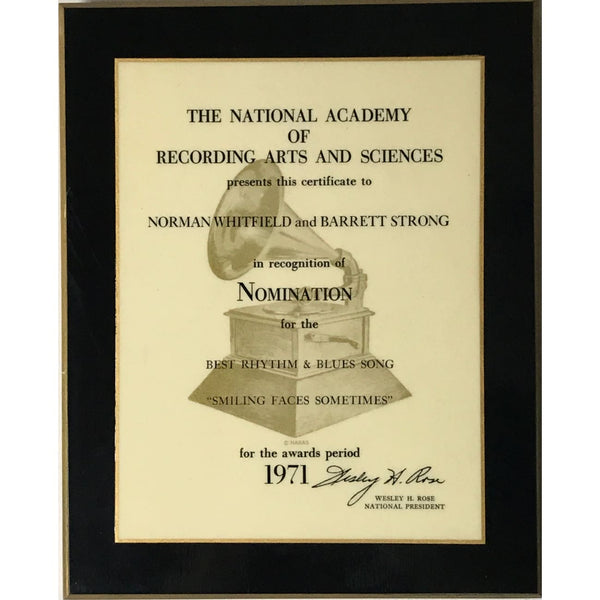 Norman Whitfield & Barrett Strong presented 1971 Grammy® Best R&B Song Nomination Plaque for their hit "Smiling Faces Sometimes", as performed by The Undisputed Truth. Released on May 13, 1971, the track reached #3 on the Billboard Hot 100. Earlier in 1971 the track was recorded by The Temptations, but the bigger success came from The Undisputed Truth's version.
