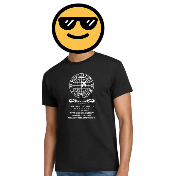 Celebrate the White Owls/The Shivers World Pro Fun Tour 2026 All Star Band show with this cool t-shirt! World Pro Fun Tour logo with artists, date and venue on the front of the shirt. Quality GILDAN®100% cotton unisex t-shirt is black in color with white screen print. Sizes M, L, XL, and XXL (XXL +$3) available (choose from drop down menu).