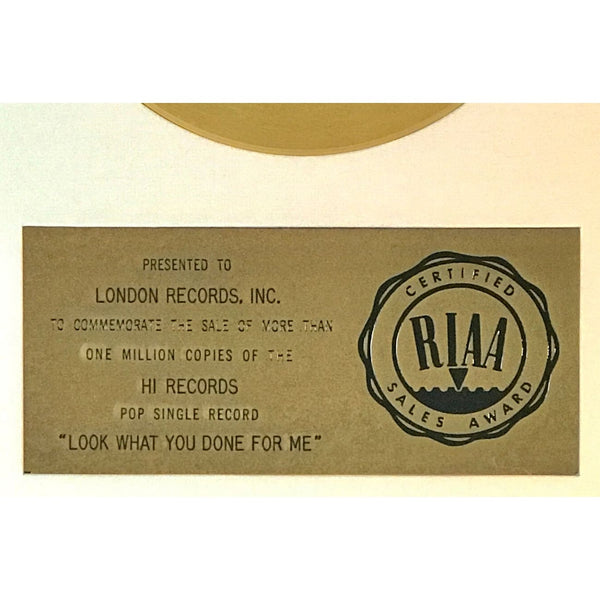 RIAA Gold Single 45 "white matte" award for Al Green track "Look What You Done For Me". The track was released in March 1972 and certified Gold by the RIAA on April 28, 1972 for one million copies sold.*