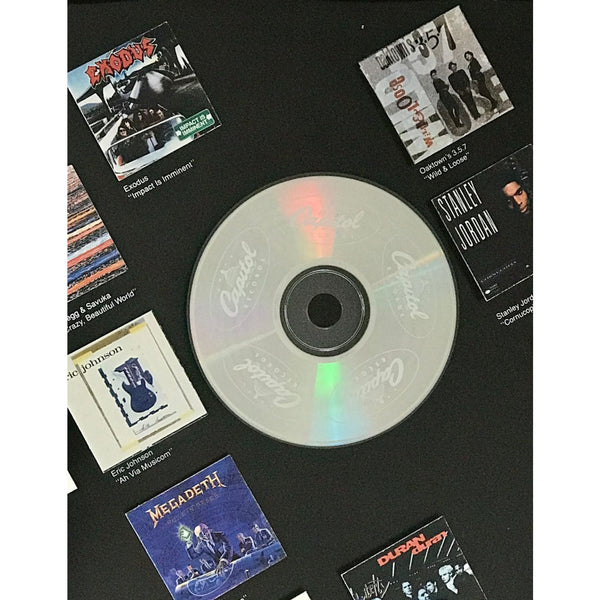 Capitol Records 1990 combo award for albums from 24 artists with album miniatures in a unique display. Artists represented include Duran Duran, Megadeth, Poison, The Smithereens, Paul McCartney, Cocteau Twins, Donny Osmond, The London Quireboys, Bonnie Raitt, The Whispers, Freddie Jackson, Lou Rawls, Eric Johnson, Johnny Clegg & Savuka, Joe Cocker, Heart, Exodus, Mellow Man Ace, Oaktown’s 357, Stanley Jordan, and King Tee.