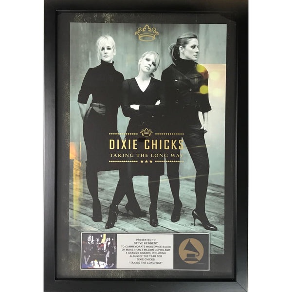 In-house award for Dixie Chicks (The Chicks) album Taking The Long Way, celebrating over three million in sales and five Grammy Award wins in 2007, including Album of the Year, Record of the Year, and Song of the Year. Released on May 23, 2006, the album was certified 2x Multi-Platinum by the RIAA for two million copies sold in the U.S. in 2007.* (Note: While made by the same company that made RIAA awards, this is not a RIAA award).