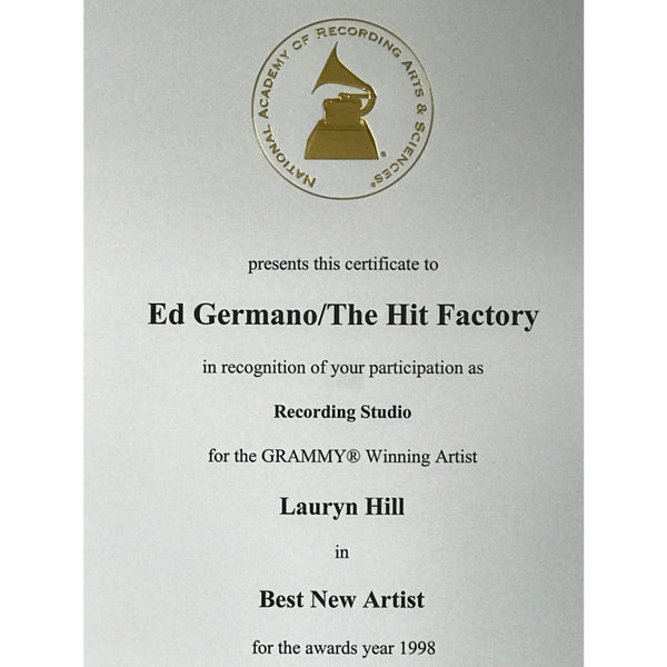 Grammy® Win Studio Participation Plaque for Lauryn Hill, who won Best New Artist at the Grammy Awards in 1998. The plaque is presented to The Hit Factory®, the recording studio in New York City where much of the album was recorded, along with the studio owner the late Ed Germano, who owned the studio since 1975. Dated 1998, the plaque is in VG to Excellent condition.