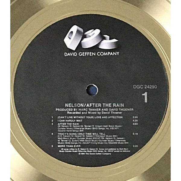 RIAA Gold Album Award for Nelson album After The Rain. The album was released on June 26, 1990 and was certified Gold by the RIAA on Sept. 26, 1990 for 500,000 copies sold.*