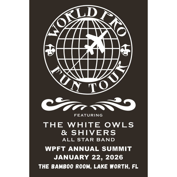 Celebrate the White Owls/The Shivers World Pro Fun Tour 2026 All Star Band show with this cool t-shirt! World Pro Fun Tour logo with artists, date and venue on the front of the shirt. Quality 100% cotton unisex t-shirt is black in color with white screen print. Sizes M, L, XL, and XXL (XXL +$3) available (choose from drop down menu).