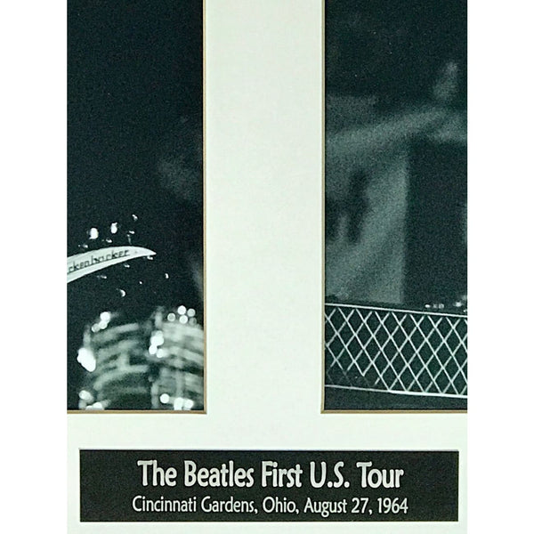 This collage includes four of these fantastic photos, shot that day by photographer Walt Burton. They photos are developed from the original Kodak Tri-X 35mm negatives and the four 8" x 10" prints are matted and framed with acid-free materials to a framed size of approx. 25.5" x 20.5". The collage also has an engraved metal title plate reading: The Beatles First U.S. Tour, Cincinnati Gardens, Ohio, August 27, 1964.