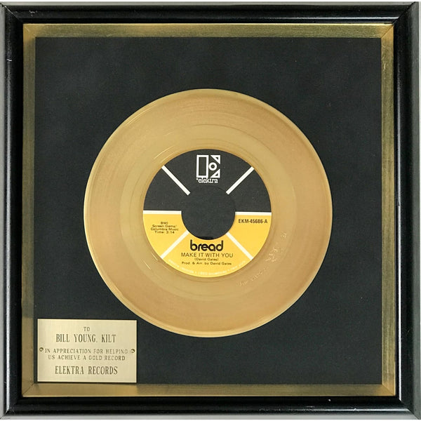 This 1970 label award made by Disc Award Ltd. recognizes success of the classic Bread track "Make It With You". Written by David Gates, the track appeared on Bread's 1970 album On The Waters. It became the group's first top 10 Billboard Hot 100 hit single, reaching #1 in August 1970. It also peaked at #5 on the UK Singles Chart. The single was in fact certified Gold by the RIAA in August 1970 (Note: This is not a RIAA award).