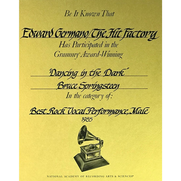 Grammy® Win Studio Participation Plaque for Bruce Springsteen track "Dancing In The Dark" from his Born In The U.S.A. album, which won for Best Rock Vocal Performance, Male in 1985 at the Grammy Awards. The plaque is presented to The Hit Factory®, the recording studio in New York City where much of the album was recorded, along with the studio owner the late Ed Germano, who owned the studio since 1975. Dated 1985, the plaque is in VG to Excellent condition.