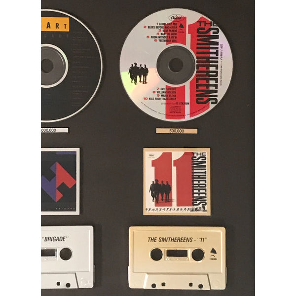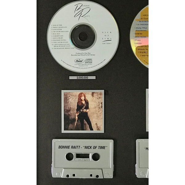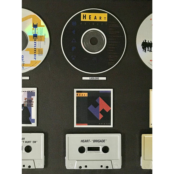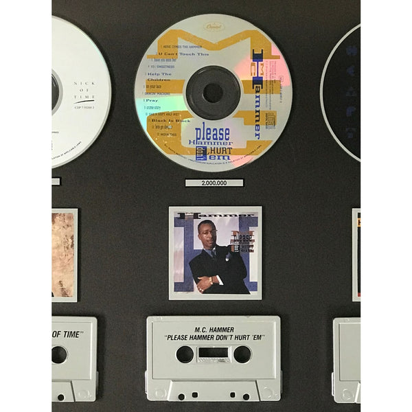 Capitol Records 1991 combo award for albums from Heart, MC Hammer, Bonnie Raitt, and The Smithereens with album miniatures, CDs, and cassettes. The award recognizes the success of these artist's albums released in the 1990-91 timeframe.