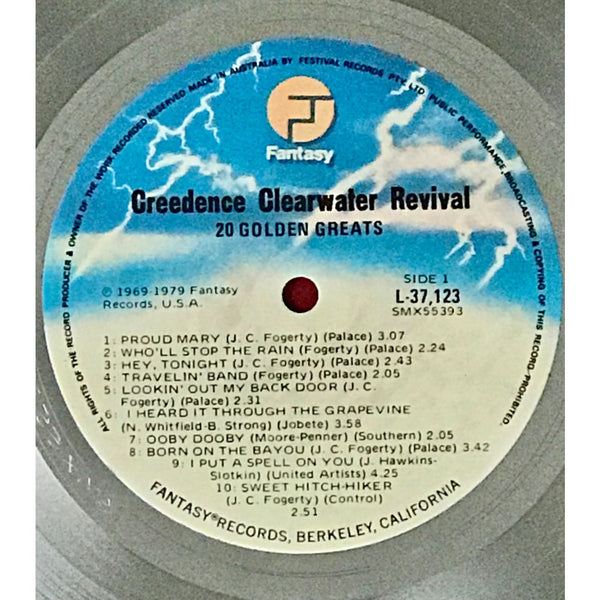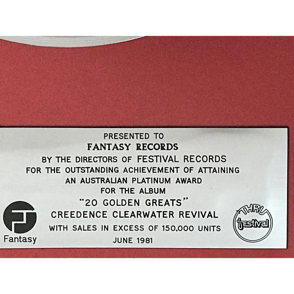 1981 Australian Platinum Record award for Creedence Clearwater Revival album 20 Golden Greats. Released on the Fantasy Records label in Australia and New Zealand, the album topped the Australian album charts in 1980. It featured top hits from CCR's career such as "Proud Mary", "Born On The Bayou", "Who'll Stop The Rain", "Fortunate Son", and more.