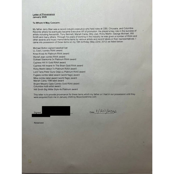 Blair played a key role in the success of artists including Cypress Hill, Fugees, LL Cool J, Outkast, Billy Joel, Billy Idol, Aerosmith, Tony Bennett, Mariah Carey, Ricky Martin, George Michael, Will Smith and many others. The award is accompanied by a letter of provenance from Blair's son, who later took possession of his father's awards and memorabilia (see image of letter, son's name is redacted on image, buyer will receive unredacted copy).