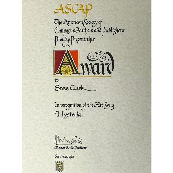 Original 1989 ASCAP (American Society Of Composers and Songwriters) Award for Def Leppard song "Hysteria" presented to Steve Clark. These awards are presented to the writers or co-writers of hit songs, in this case the track was written by Def Leppard members Clark, Joe Elliot, Rick Savage, and Phil Collen, along with album producer Robert John "Mutt" Lange. The title track from the group's multi-million selling Hysteria album, the song became the group's first top 10 on the Billboard Hot 100 chart, slotting in at #10. Clark co-wrote numerous other Def Leppard tracks as well.