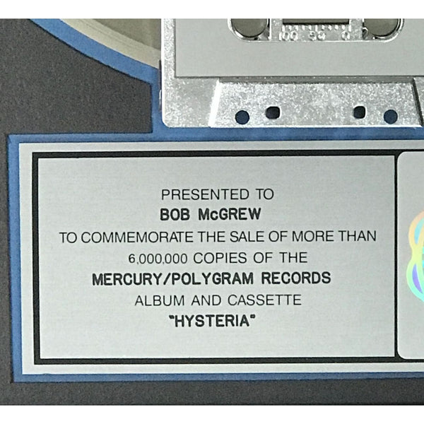 RIAA 6x Multi-Platinum Album award for Def Leppard album Hysteria. Released on August 3, 1987, the album was certified 6x Multi-Platinum by the RIAA on Aug. 18, 1988 for six million copies sold.