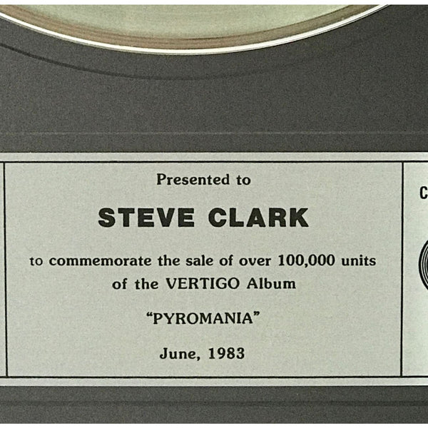 CRIA (Canadian Recording Industry Association) Platinum Album Award for Def Leppard album Pyromania presented to guitarist Steve Clark. Released on Jan. 20, 1983, the album was certified Platinum by the CRIA on June 1, 1983. Remember late Def Leppard guitarist Steve Clark (1960-1991) with this award.