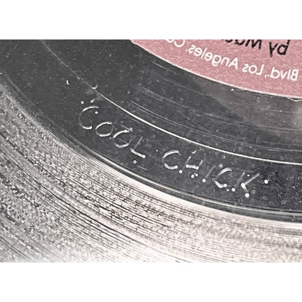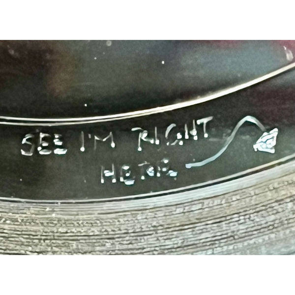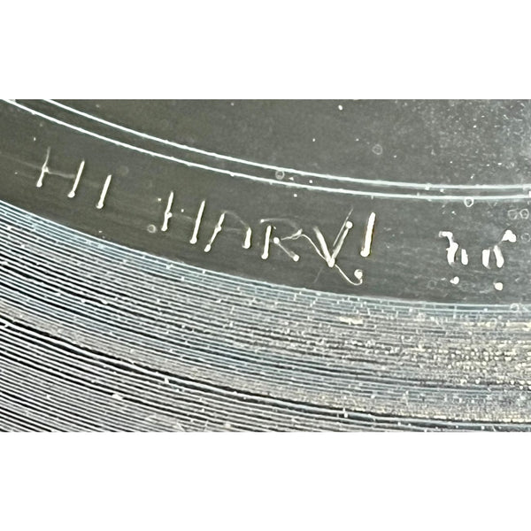 The award is in VG condition with typical frame wear and some degradation of the record label. The metal mother disc has some tiny but interesting engraved notes in the dead wax area. They read: "Hi Harv!", "See I'm right here" (with arrow), and "Cool Chick". They are in reverse because they are on the mother disc--images show them un-reversed. All components of the award are original except the plexiglass was replaced with real glass at some point and it accordingly has also been rebacked with a wire hanger installed in place of the original sawtooth hanger.