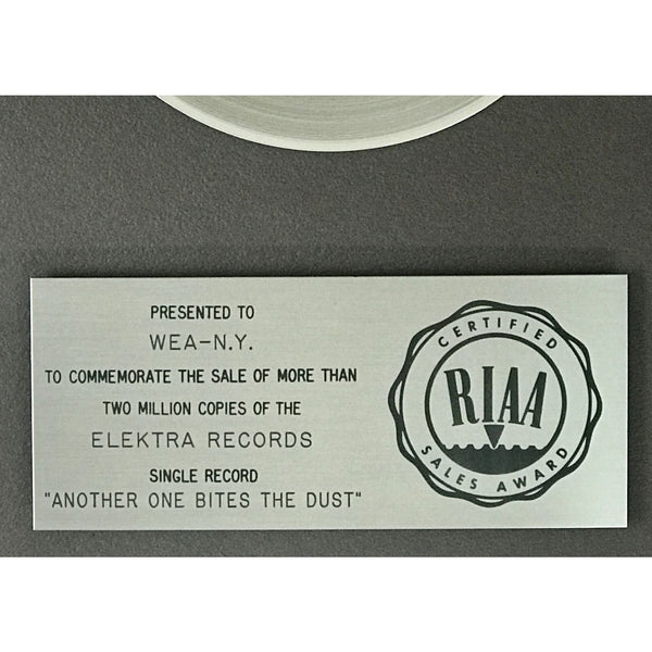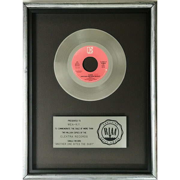 RIAA Platinum Single 45 award for Queen's iconic track "Another One Bites The Dust". Released on Aug. 22, 1980, the track was certified Platinum by the RIAA on an unknown date (likely sometime in 1981) for two million copies sold. By 2025 the single was listed in the RIAA database as being certified 9x Multi-Platinum by the RIAA for nine million copies sold but note that it is now shown only as a "Digital" single award.*