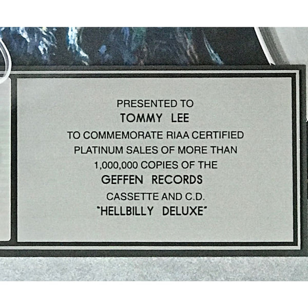 RIAA Platinum Album award for Rob Zombie album Hellbilly Deluxe presented to and signed by Mötley Crüe drummer/songwriter Tommy Lee. Released on Aug. 25, 1998, the album was certified Platinum by the RIAA on Nov. 4 1998 for one million copies sold.