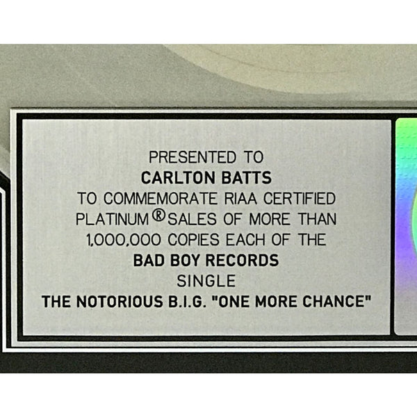 Detailed Item Description: This RIAA Platinum Single award with Bad Boy Record logos was manufactured in 1998, making it approx. 27 years old. It is presented to Carlton Batts, who mastered the track and numerous other Notorious B.I.G. recordings, along with tracks and albums by Aaliyah, Big Daddy Kane, Eric B. & Rakim, Janet Jackson, and many others. A letter of provenance from the award recipient will be provided with purchase (see image).
