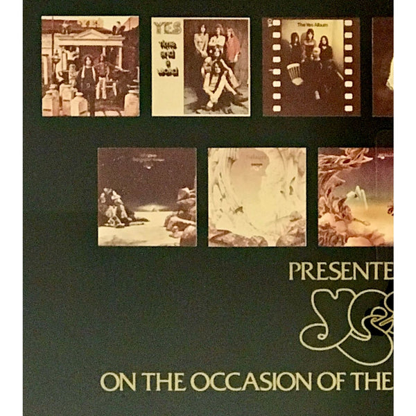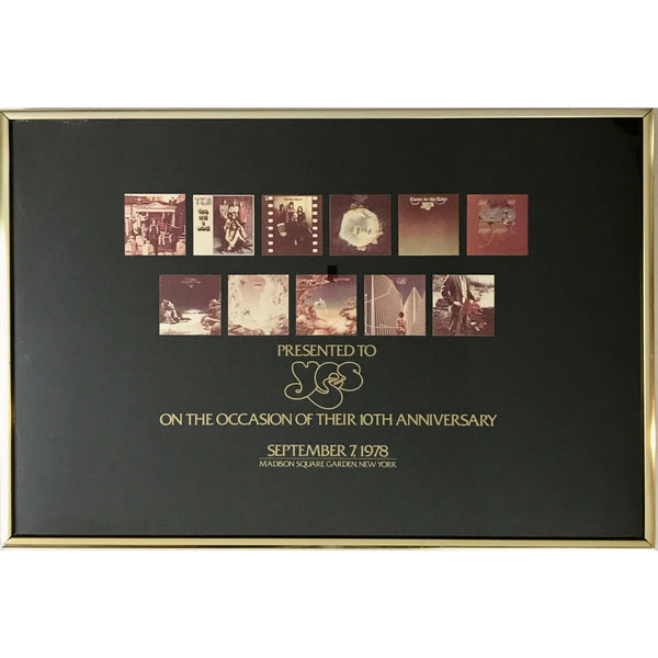 Yes 1978 10th Anniversary Combo Album Plaque presented to Yes. This plaque from Atlantic Records recognizes the ten years that Yes was together as a group at that point and their ten albums to-date are pictured. Remember Chris Squire (1948-2015) and Alan White (1949-2022) with this plaque.